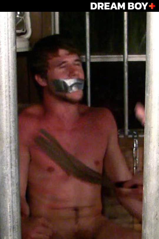 Jackson struggles against the heavy chains that bind his body to the metal bars of his cell. Frustrated, he yells out for anyone to come and let him free, even begins to shout for his captor to come back and challenge him. But as the friction of the chains heats up his body, his hand wanders to his dick, and Jackson cannot help but stroke it momentarily before Master DJ returns. Flipping his prisoner onto his belly, he reshackles the chains to through the metal cell bars and then attacks Jackson with his riding crop and malicious taunts.