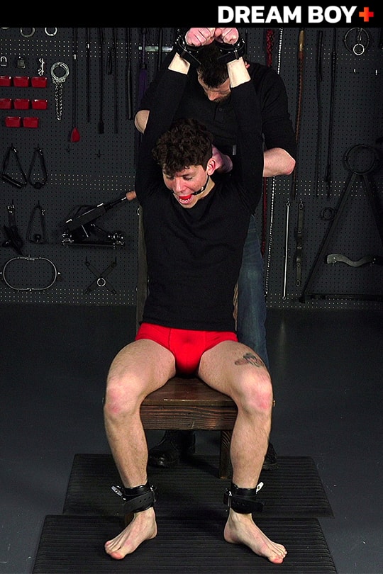 Young Grey Gould is allowed to rest for the night, splayed face-up on a wooden rack, naked, arms chained overhead. Axel Johnson enters, horny as hell and ready for fun. He sucks Grey’s cock then cranks a winch that, to Grey’s great surprise, stretches his young body taut. The boy moans and scrunches his eyes as the older man rubs oil all over his supine body and plays with his nipples. Then the real fun begins: Axel stretches Grey tighter and tighter until he screams in agony. He continues to play with Grey’s cock and strokes his taut muscles, enjoying the strain emanating from them. “Now you are going to cum for me,” he says, loosening the chains. “Yes, sir! Thank you sir!” the boy replies, as his dick hardens with each stroke by his master. Despite the pain, he ejaculates a huge load of cum. His reward? He's stretched painfully again and left lone in the dungeon to suffer for hours.