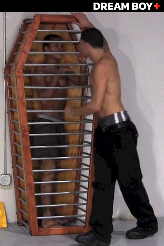 Julius has only been cleaning the dungeon for a few weeks. At first, he was freaked out, but now he finds himself totally turned on by all the kinky apparatus. Plus, he is really turned on by his sexy co-worker, Parker. He’s so obsessed he decides he will actually kidnap the boy – and use him to act out all his kinky fantasies. One night, when the two are alone, Julius jumps his prey and smothers him with a chloroform-soaked rag. He rips off Parker’s clothes, leaving him in just his boxers, then drags him over to his favorite prop – the “mummy tomb” – and seals him behind its steel bars, unconscious and entombed. Parker awakens an hour later, dazed and confused. "You're my bitch now! Start acting like it!" Julius yells. Parker is terrified and does exactly what he is told. "Take your fucking boxers off!" Julius demands, eyeing up his sexy bondage boy. Parker strips, getting even more terrified but feeling a strange tingle in his cock. Master Julius then strips as well – and forces Parker to suck his dick through the bars of the tomb. His fantasy becomes complete when he gets his mouth on his entombed prisoner’s dick, too. Next week in the Dungeon: More Torture for Parker...