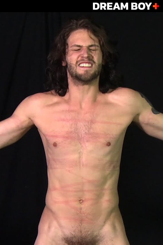 Rope man J.J. has been given the gift of a lifetime: The opportunity to tie up and inflict pain upon a famous porn star, the lovely and talented Duncan Black. He has the boy bound and displayed between two wood posts, the rope marks from hanging in a hog tie still prominently evident on Duncan’s torso. J.J. will add some additional decoration to the beautiful boy’s chest and stomach: deep lash marks from his whip.