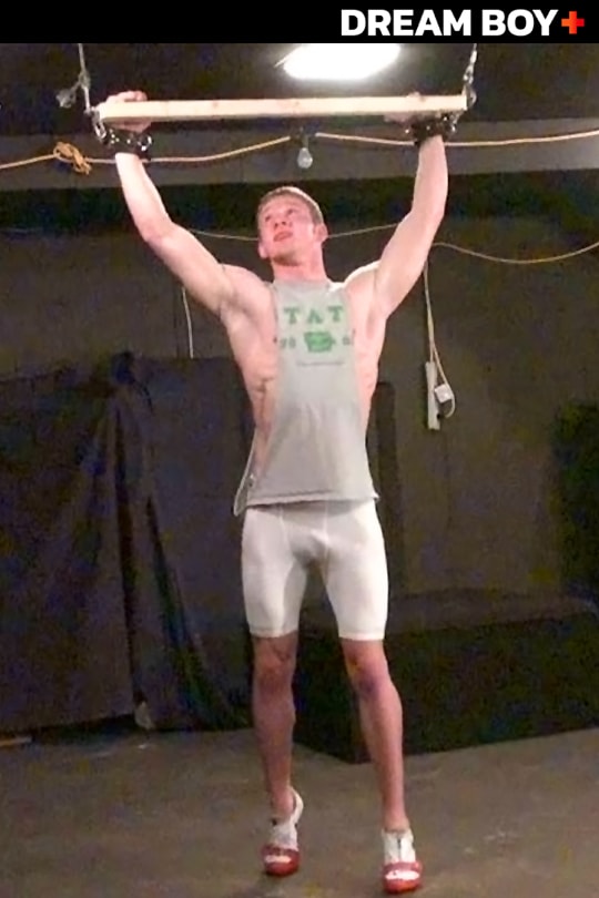 Max's punishment comes to a climax when the hogtied jock is lifted off the display cube and left swinging in mid-air. The strain on his arms and back is unbearable, even for a young athlete in peak physical condition. When Max is finally lowered and unchained, he is no longer a cocky and arrogant jock, but a compliant and submissive boy. Next week: Ben returns.