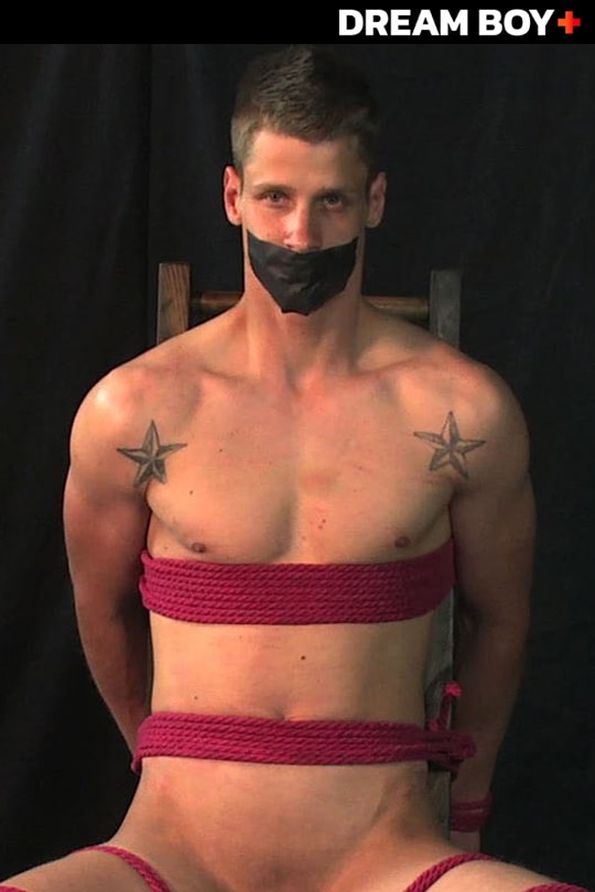 Seth remains roped to the bondage chair. His smooth, hairless body is completely naked, but for several layers of red rope and a tape gag over his mouth. He shakes his head, half in anger, half in fear, when rope man J.J. appears with a new torture device: the pinwheel. Seth groans through his gag as J.J. rolls the razor-sharp pins over his pecs and nipples, then back-and-forth over his flat stomach, then back and forth over his shoulders and arms, then finally over his pubic area, inner thighs and – you guessed it – his cock. Next, J.J. attached biting plastic clamps to Seth’s nipples, then two more on his ball sack and an especially nasty one right on the tip of his cock.