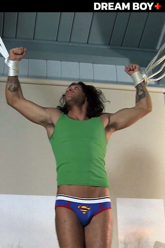 Rope man Matt picks up a new pretty boy at the local club, a super-hot, long-haired California dude who has always fantasized about being tied up, so he allows Matt to take him home. After Matt tells him to take off his pants and strip down to a tight muscle shirt and undies (Superman! How Californian), Shawn starts to have second thoughts. But still, he lets Matt lead him out of the bedroom and tie his ankles, then rope his arms to the beams in the ceiling. “Stop, just let me go,” Shawn whimpers as Matt binds him in a Jesus-like crucifixion pose and cuts off his shirt. Matt is amazed at how beautiful this boy is. He knew he was built but he didn’t know he was this built, with lean, sculpted muscles from head to toe. Now it’s time to see how good his cock and balls are. Wow. Huge and pendulous.