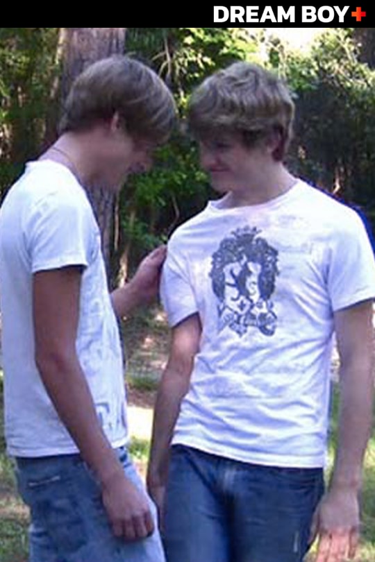 Lee and Donnie take their playful butts indoors. Donnie hops on the bed, enthusiastic about being tied down. Lee delicately wraps a soft rope around Donnie's wrists and ankles, looping them tightly around the bed posts. He then strips and straddles Donnie's chest, wearing underwear that show off his sexy butt. With Donnie tied down, Lee tickles his chest and armpits as Donnie screams with laughter. Lee moves down to the boy's feet and tickles them, too. Next, he grabs Donnie's dick and puts it in his mouth, sucking the cock until it is hard and then tickles him again.