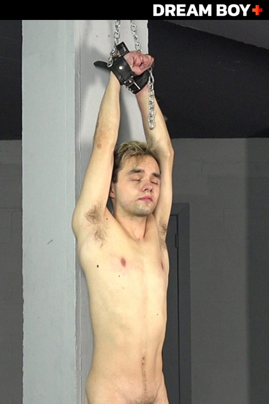 Blonde muscle twink Marcus hangs upside-down on the inversion gurney. “Please, sir,” he begs as his master periodically beats his chest and abs with the flogger. The young boy looks so delicious, stretched out, naked, totally helpless, struggling agains his chains, ribs showing under his lovely skin, his stomach sucked-in hard, so lean you could pinch it between your finger and thumb. Then his master whips his nipples and navel with a riding crop, making the boy flail about and scream, even more so when his fresh wounds are soaked with alcohol. Young Marcus is finally taken down and chained to a wall. He’s ordered to cum for the third time in as many hours. “Please, sir. I’ll cum for you if you let me go,” he begs. He busts a huge load of cum, again, the perfect boy toy, but he is going no where. He’ll spend the night chained against a concrete wall, naked and alone. Tomorrow he will be sold to the highest bidder.